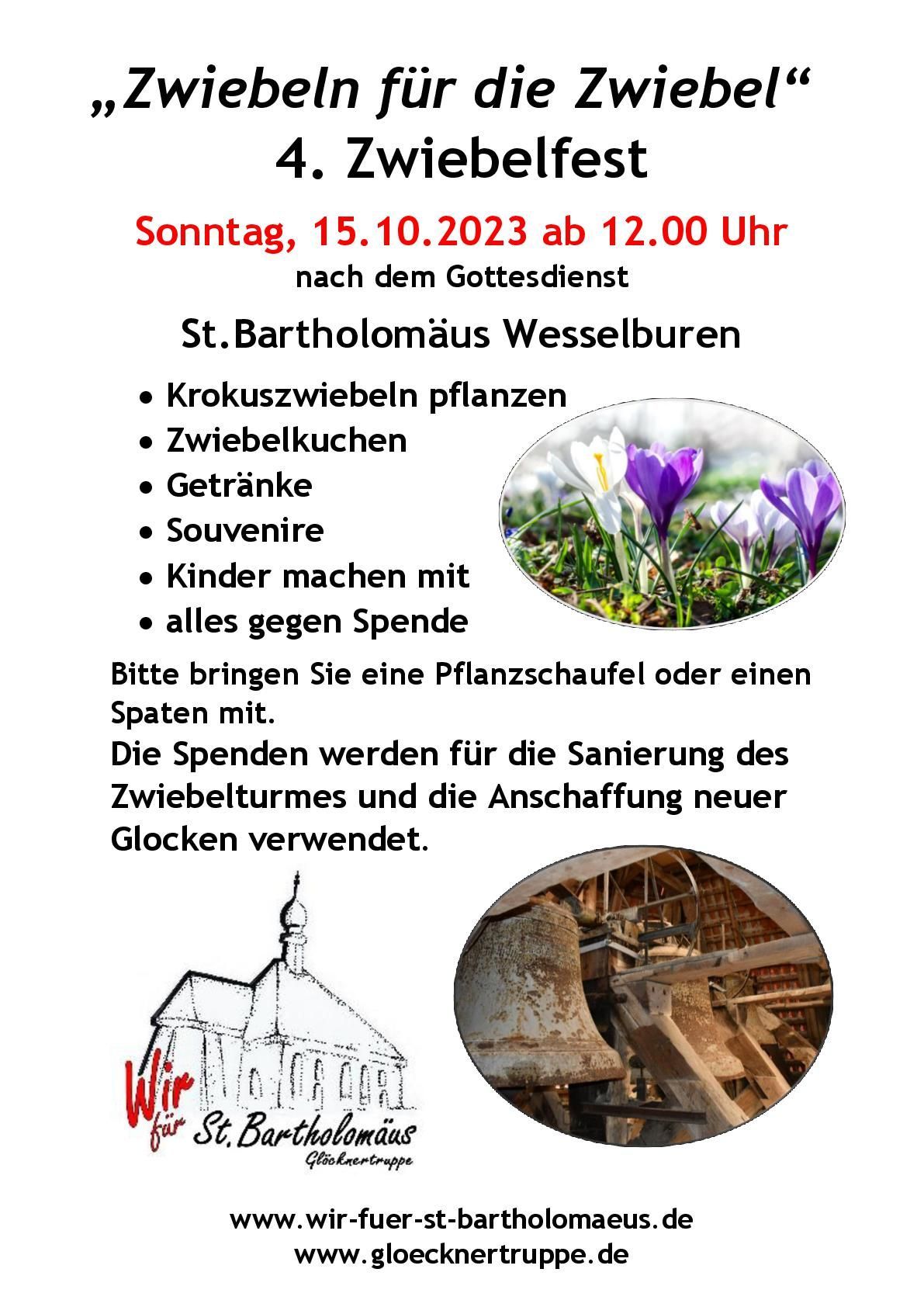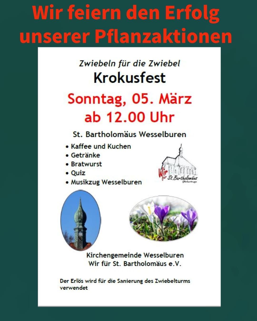 Die Kirchengemeinde Wesselburen und der Verein Wir für St. Bartholomäus e.V. laden ein zum Krokusfest am 5. März ab 12 Uhr in und vor der St. Bartholomäus Kirche Wesselburen. Zwiebeln für die Zwiebel- unter diesem Motto veranstalten beide gemeinsam seit drei Jahren im Herbst eine Pflanzaktion rund um die St. Bartholomäus Kirche. Jetzt soll der im wahrsten Sinne des Wortes sichtbare Erfolg gefeiert werden. Rings um die Kirche erscheinen die Krokusse und Schneeglöckchen und zaubern bunte Farbtupfer auf die Wiese. Am 05. März 2023 ab 12 Uhr direkt nach dem Gottesdienst geht es los. Die Pfadfinder werden leckere Bratwurst vom Grill zubereiten, die Frauenhilfe kümmert sich um Kaffee und Kuchen, der Welt-Laden hat geöffnet und bietet Getränke und verschiedene Süßigkeiten an. Bei einem Quiz für jung und alt können Preise, die von Wesselburener Bürgern, Geschäftsleuten und Banken gespendet wurden, gewonnen werden. Die Preisverleihung ist um 13.30 Uhr nach dem Konzert des Musikzug Blau-Weiss Wesselburen. Alle Speisen und Getränke werden gegen Spende abgegeben. Die Spenden werden für die Sanierung des Zwiebelturmes verwendet.